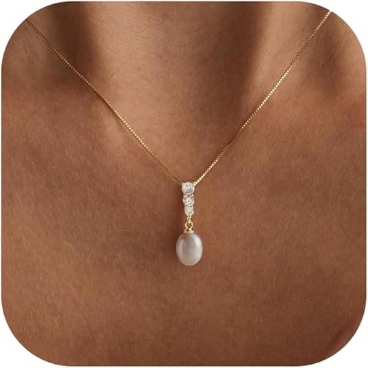 Ewrkbr Pearl Necklaces for Women, 14K Gold Plated CZ Single Pearl Pendant Necklace Dainty Gold Necklaces for Women Trendy Classic Bridal Wedding Necklace Fashion Gold Jewelry
